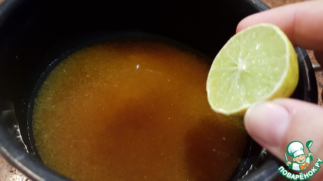 Сироп. Как только поставили басбусу в духовку, следует сварить сироп. Для этого, всыпать в ковшик сахар и залить водой. Добавить сок одного лайма или 2 ст. л. сока лимона и ванильную эссенцию. Довести сироп при постоянном помешивании до кипения и варить на среднем огне три минуты. Выключить и оставить остывать.