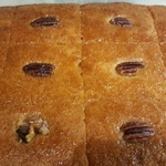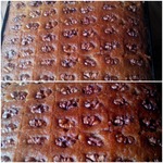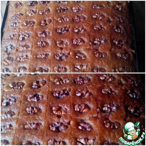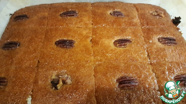 Разрезать острым ножом басбусу на квадратики, так, чтобы в середине каждого квадратика был орех. Полить басбусу сиропом, равномерно. Удобно использовать ложку, но я поливала прямо из ковшика.
