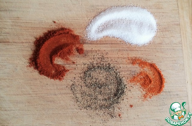 Посыпать специями по вкусу. У меня паприка, кайенский перец, черный перец, соль.