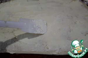 Тесто разделить на 2 части, каждую раскатать в прямоугольник и нанести тонким слоем масляно-творожную смесь.
