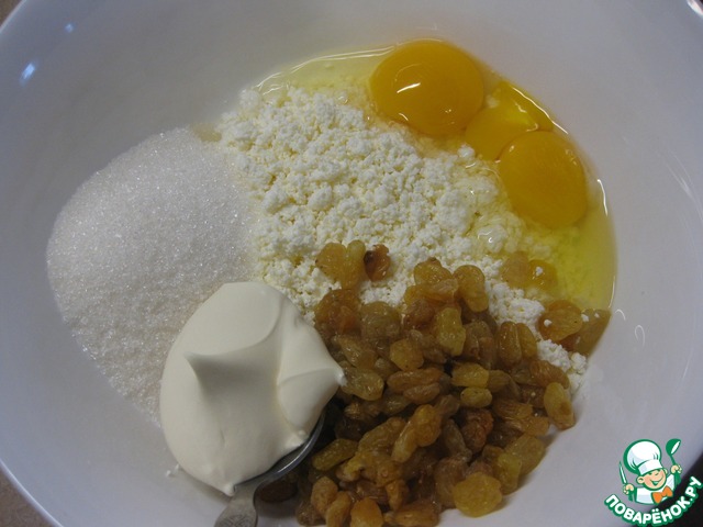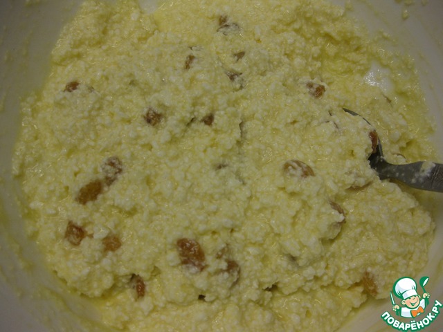 Пока варится каша, изюм замочить в кипятке минут на 5, слить воду и обсушить. Приготовим творожную массу: в творог добавить 2 яйца, изюм,1 ст. л. сахара, 1 ст. л сметаны