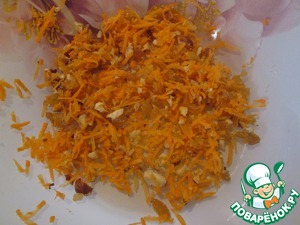 Отдельно смешать тертую морковь, орехи, изюм.