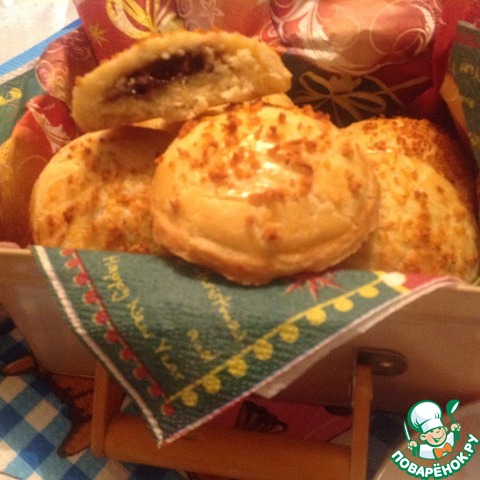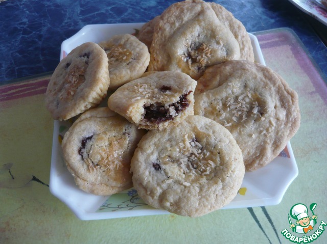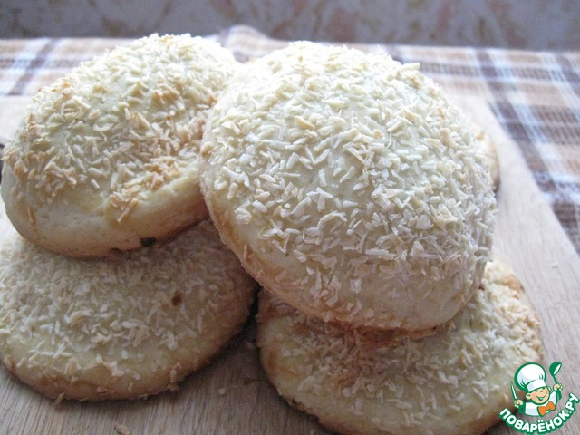 Прикрыть оставшимися кружками теста, края прижать, смазать взбитым яйцом или только желтком, посыпать сверху кокосовой стружкой. Шпателем переложить печенье на слегка смазанный противень.