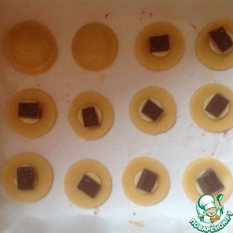Тесто раскатать в пласт, вырезать формочкой или стаканом круги. Банан нарезать кружками, шоколад разломать на кусочки.