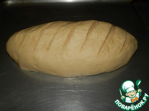 Можно тесто приготовить в хлебопечке, но пеките лучше в духовке. Поставить в тёплое место для подъёма на часок. Как тесто поднимется, обмять, сформировать батон и положить его на смазанный противень. Сделать лёгкие поперечные надрезы и оставить минут на 30, чтобы тесто ещё раз поднялось. -