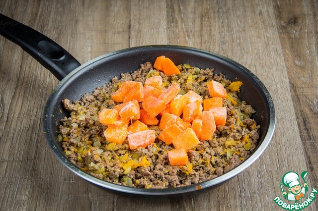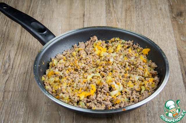 Первым делом необходимо приготовить мясное рагу. Для этого на сковороде с толстым дном разогрейте растительное или оливковое масло. Обжарьте лук нарезанный на мелкие кубики до прозрачности. Затем добавьте натертую морковь и обжаривайте все вместе около 4-5 минут. Обжаренные овощи достаньте из сковородки и отложите. На сковородку добавьте ещё немного масла и положите фарш из говядины. Обжаривайте его до золотистости, измельчая ребром лопатки. Верните овощи в сковородку и перемешайте