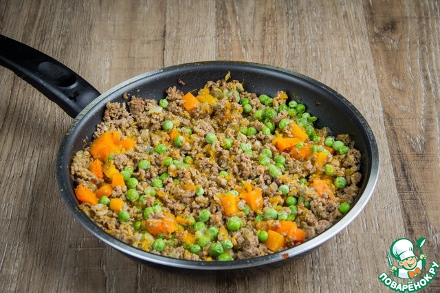 Добавить зеленый горошек, свежий или замороженный. Томить ещё несколько минут.