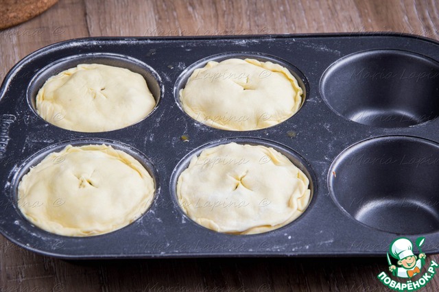 Каждый пай накрываем крышечкой из теста. Делаем надрез по середине крест-накрест. желток взбиваем и смазываем сверху.