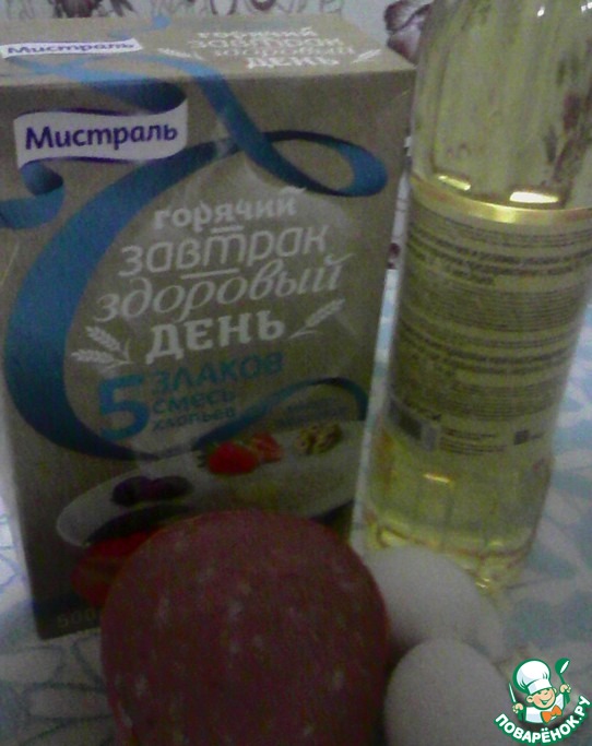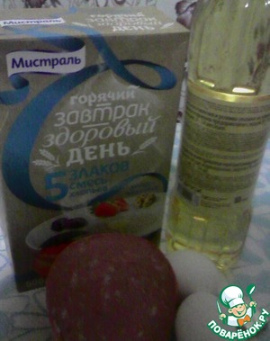Продукты, которые мне понадобились: пятизерновые хлопья "Мистраль", яйца, колбаса, бульонный кубик, растительное масло (для жарки), вода.