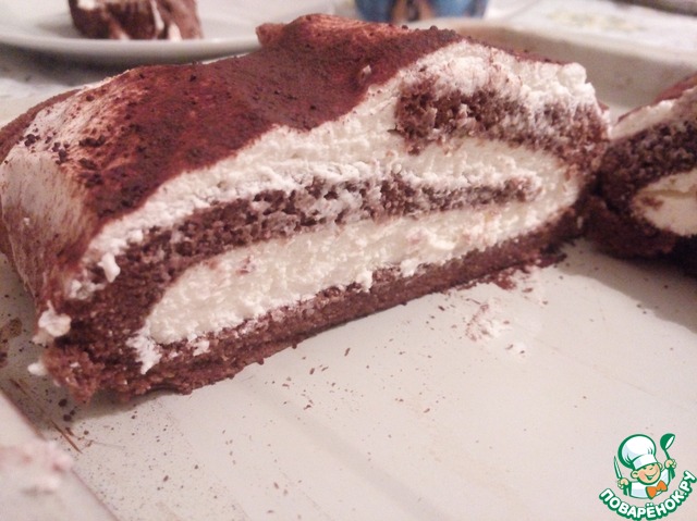 Охлажденный бисквит подрезать по краям, придав прямоугольную форму. По желанию можно сделать пропитку из сваренного с сахаром кофе, смазать кисточкой поверхность бисквита. Мысленно разделить бисквит на 3 части, покрыть кремом сначала среднюю часть, затем накрыть третью бисквита, проложить еще слой крема, накрыть другим краем бисквита. Сверху проложить дорожку из крема, посыпать какао-порошком перед непосредственной подачей.
