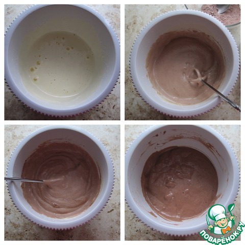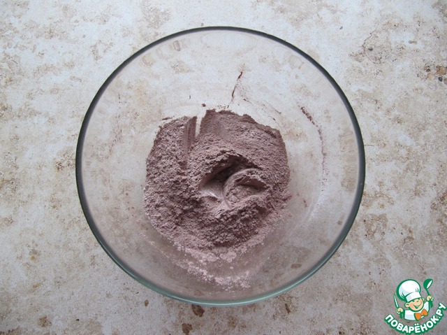Пшеничную муку в/сорта (60 г) просеять два раза с какао-порошком (10 г) и разрыхлителем теста (1 ч л).
