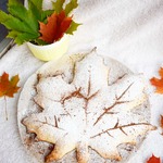 Разделите на две части, каждую раскатайте в круглый пласт диаметром примерно 25 см. С помощью шаблона из бумаги вырежьте кленовый лист. Переложите заготовку на противень, застеленный силиконовым ковриком или пергаментом.