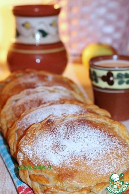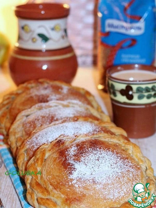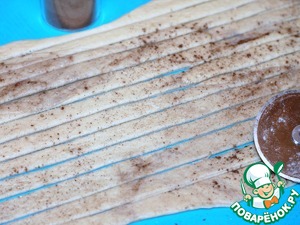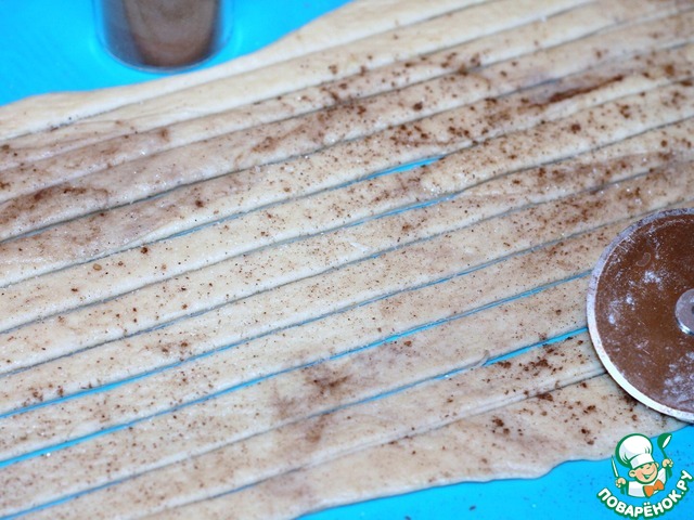 11. Две оставшиеся части теста собираем в шар и раскатываем прямоугольник длиной 35*18 см, посыпаем сахаром и корицей. Затем делим на 12 полосок.