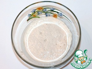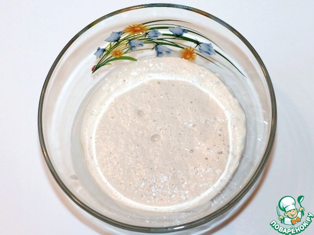 1. Приготовить опару. В тёплом молоке (100 мл) растворить дрожжи (1,5 ч. л.) с 1 ч. л. сахара. Добавить 1 ст. л. пшеничной муки, перемешать и поставить миску с опарой в теплое место на 20-30 минут до появления пенной шапочки.