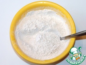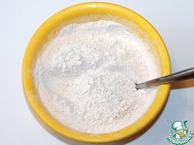 3. Смешиваем сухие ингредиенты; просеянную пшеничную муку (300 г), гречневую муку (100 г), 1 пакетик ванилина и соль.