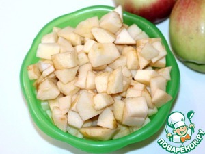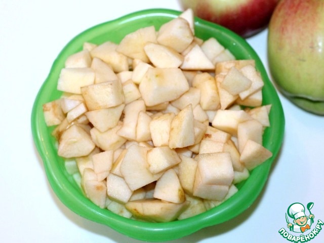 5. Пока тесто поднимается, подготовим начинку из яблок. Снять с яблок шкурку, удалить семечки и нарезать небольшими дольками. Смешать дольки яблок с крахмалом (1 ст. л) и жидким медом. Если у вас яблоки очень кислые (антоновка), то добавьте сахар 1 ст. л. в тесто, но не в яблоки.