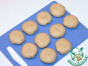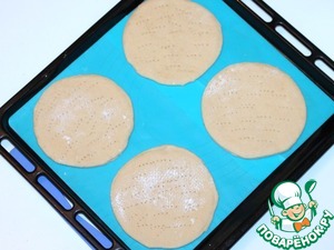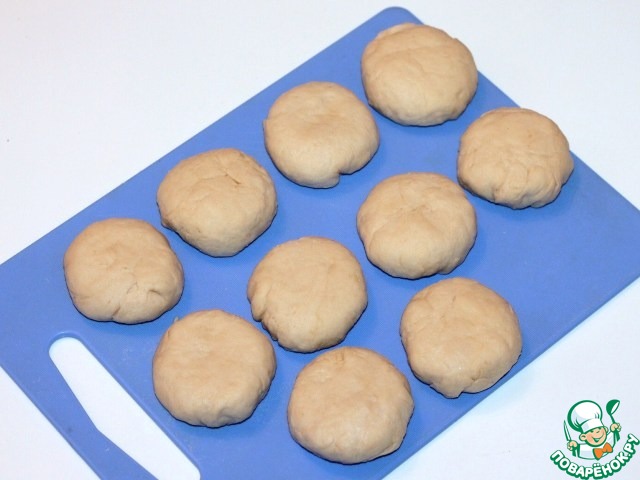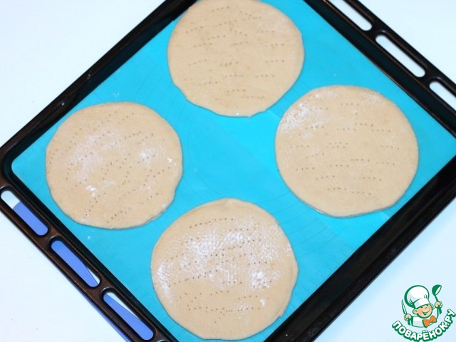 8. 8 частей теста раскатываем в лепёшки размером с чайное блюдце и толщиной ~ 0,5 см. Противень застилаем силиконовым ковриком или бумагой для выпечки (смазываем маслом). Переносим 4 лепёшки на противень, прокалываем вилкой.