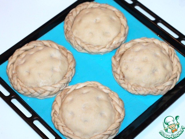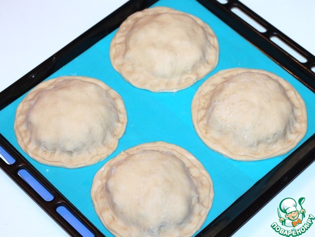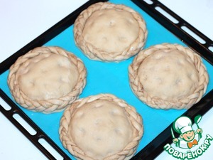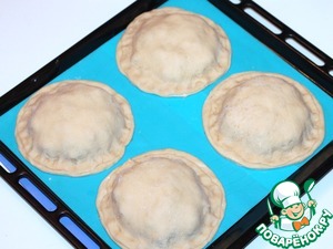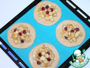 9. Кладем на каждую лепешку начинку из яблок, можно добавить ягоду. Край лепешки смазываем взбитым белком.