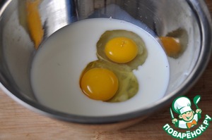 Готовим тесто. Смешиваем яйца, тёплое молоко и соль, всё взбиваем венчиком. -