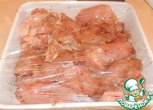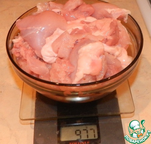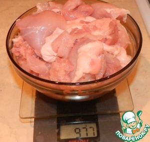 Отделяем мясо от костей, режем крупными кусочками, вместе с кожей.