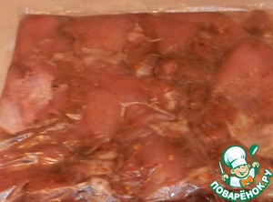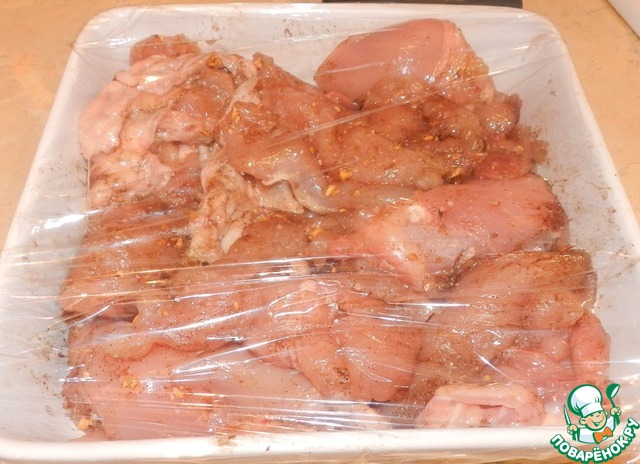Посыпаем мясо смесью соли поваренной и нитритной, специями: чеснок, мускатный орех, черный перец, перемешиваем, слегка, что бы просто равно распределить. Накрываем пищевой пленкой и отправляем в холодильник на 1 -3 часа, зреть.