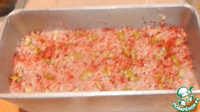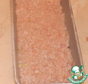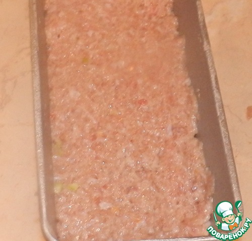 И выкладываем его в форму. Выкладываем аккуратно, что бы не сместить специи, которые у нас на дне форы. И не забываем уплотнять фарш, что бы выгнать весь воздух, который на срезе будет не красивыми дырками. -