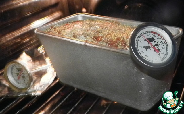 Если у вас нет кулинарного термометра с щупом, то после достижения t80 внутри духовки, готовьте мясной хлеб при этой температуре еще 2 часа.