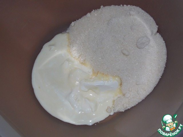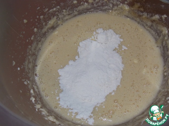 Постепенно всыпать муку, смешанную с разрыхлителем и замешивать однородное тесто.