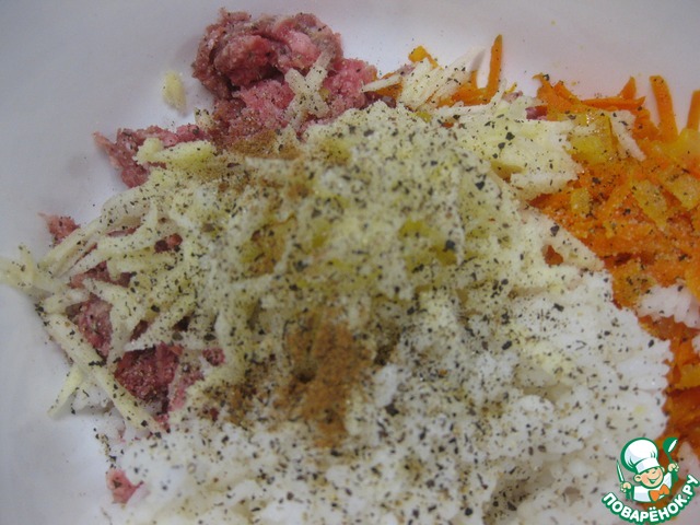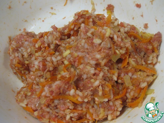 В фарш добавить отварной рис, морковь с луком, и натертое на терке яблоко, посолить, поперчить, добавить по вкусу мускатный орех