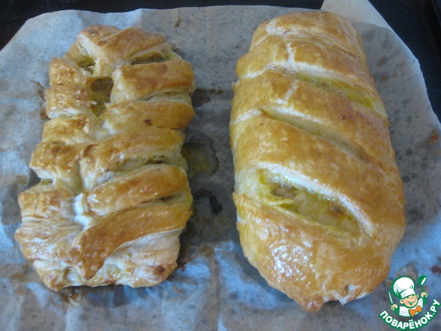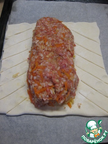 Выложить на противень, застеленный пергаментом, пласт теста, на середину выложить половину фарша, с боков сделать такие разрезы, примерно так