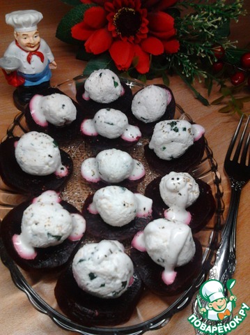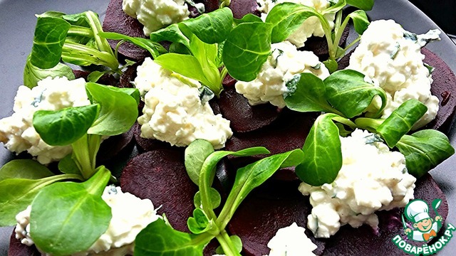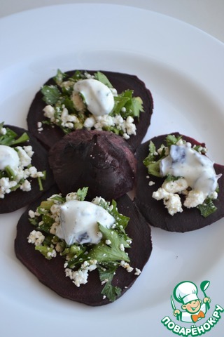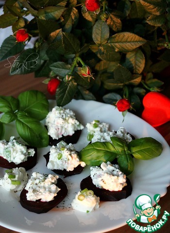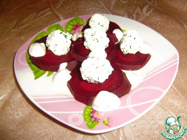 На свеклу выложить творог со специями в виде шариков, а можно просто намазать слоем. Полить соусом.