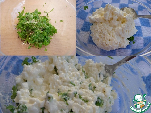 Петрушку мелко порубить, добавить чесночный порошок, черный перец, творог, слегка присолить. Перемешать.
