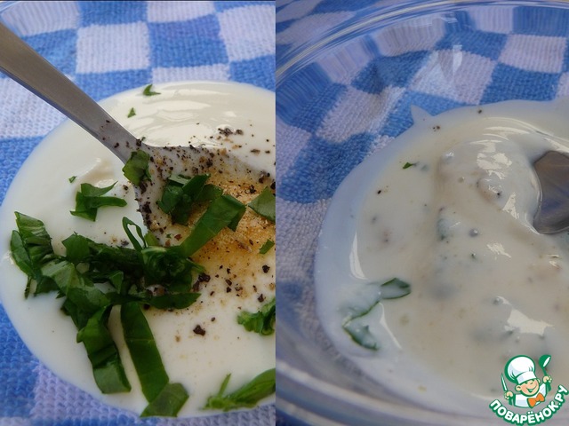 Готовим соус. В йогурт добавить чесночный порошок, черный перец, базилик.