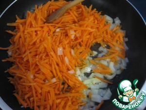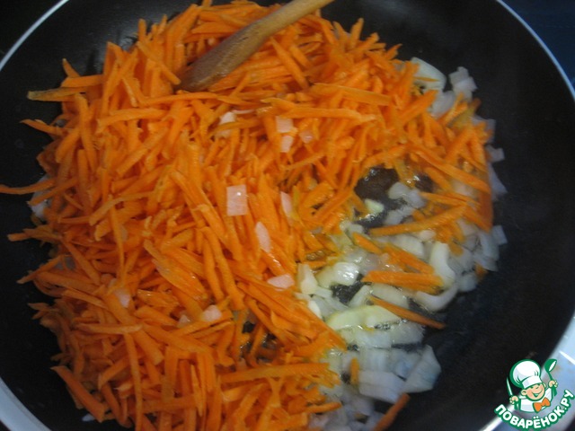 Лук нарежем мелким кубиком, морковь натрем на терке все обжарим на сковороде с добавлением масла