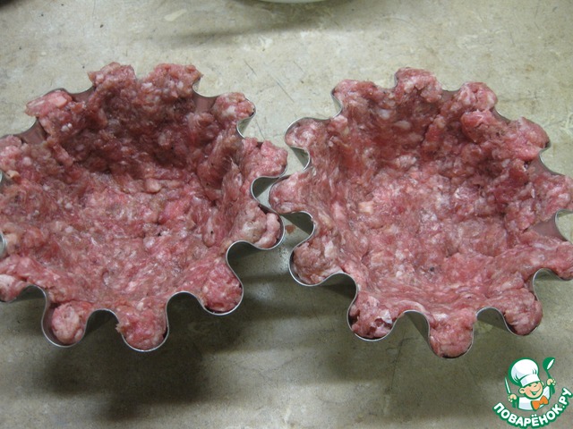Теперь фаршем выложить дно и стенки формочек, слегка приминая пальцами