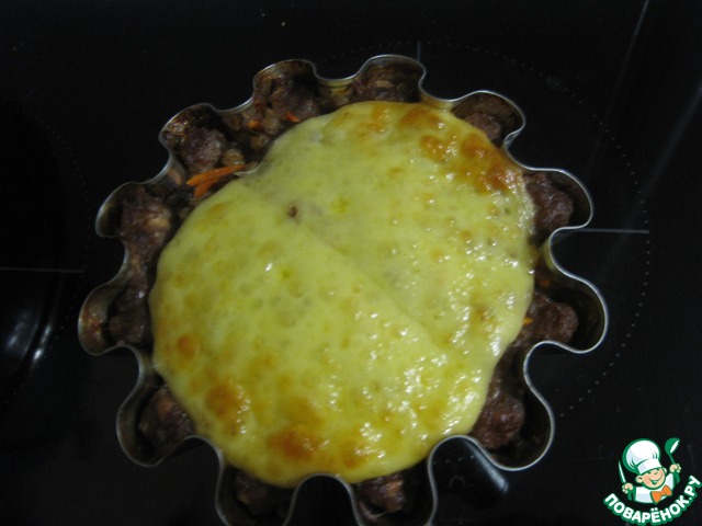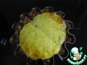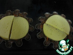 И поставить в разогретую до 220С духовку до полной готовности фарша, достать, накрыть пластинками сыра и поставить в духовку на 1-2 минуты, чтобы сыр расплавился