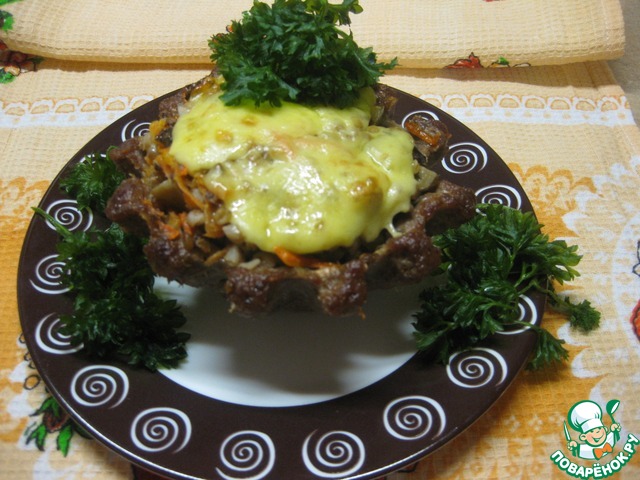 Рецепт «Гречка с грибами в мясной корзинке»: