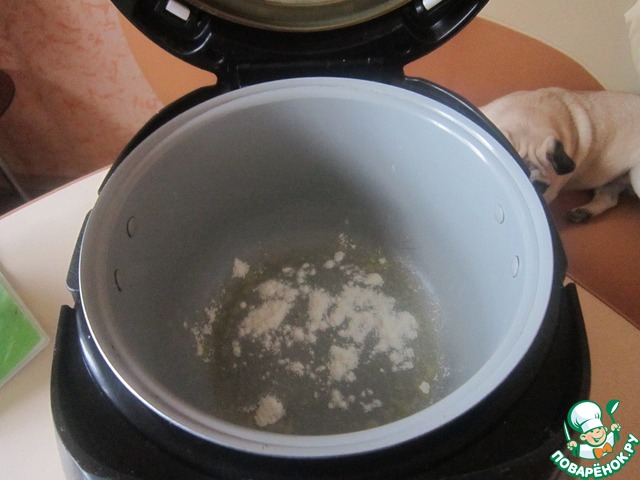Смазать чашу мультиварки маслом и чуть присыпать мукой и поставить на режим подогревание на 2-3 минуты.