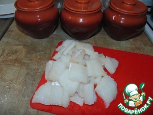 Филе трески нарезать крупными кубиками, примерно по 3 см.