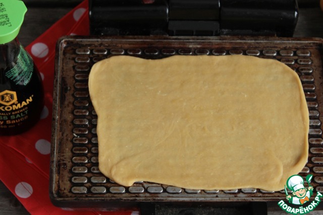 • Каждую лепешку выпекать в электровафельнице (у меня верная старушка времен Советского Союза). В процессе выпечки, скорее всего, вафлю придется развернуть, потому что тесто увеличивается в объеме и вафельница приоткрывается как книга.