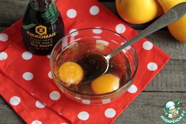 • В другой емкости смешать соевый соус ТМ "Kikkoman" (у меня соус с меньшим количеством соли), уксус 6%, масло растительное и яйца куриные.