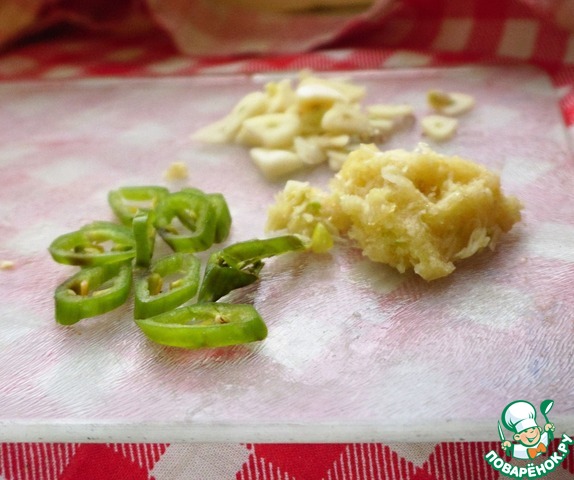 Перец чили нарезаем колечками, часть чеснока нарезаем пластинками, остальной пропускаем через пресс.