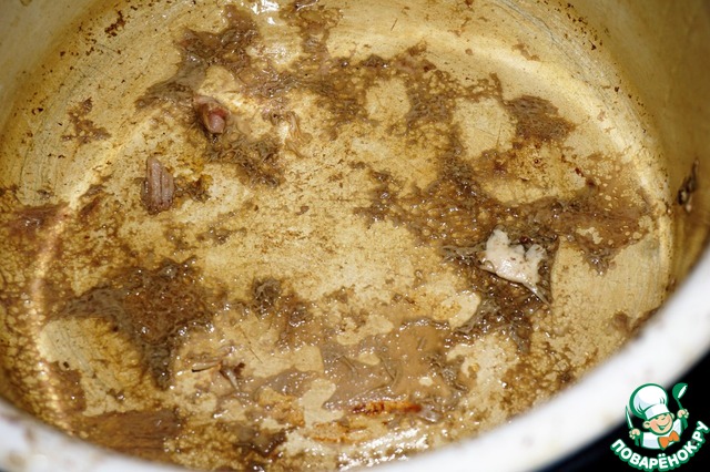Ну и, естественно, бульон нужно процедить в другую кастрюлю. Фото кастрюли, в которой первоначально варился бульон, без слов объяснить, зачем это нужно делать. Кстати, советую процеживать бульон не только для борща, но и для других первых блюд.
