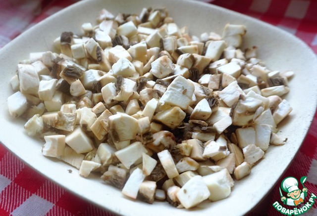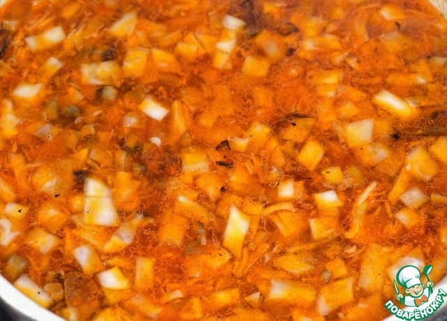 Отправляем этот картофель в кипящий на медленном огне бульон. Туда же отправляем половину сухих белых грибов.