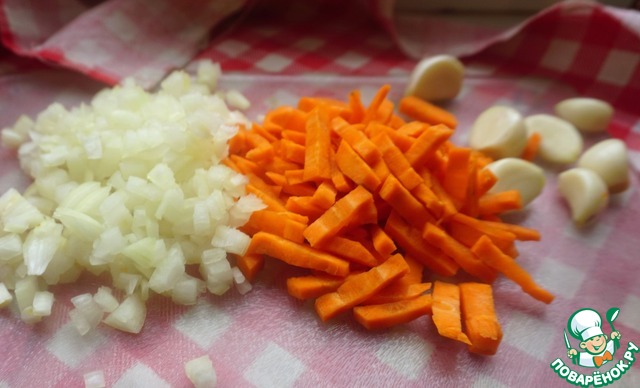 Морковь нарезаем соломкой или натираем на крупной терке, лук режем мелким кубиком. Чеснок чистим. Я люблю много чеснока. Вы уже решайте, сколько класть, самостоятельно.