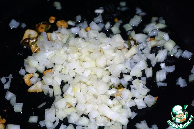 А сразу после отправки картофеля в бульон приступаем к приготовлению заправки. На разогретой сковороде поджариваем чеснок и перец чили.