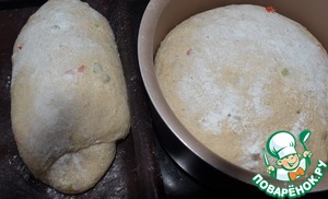 • Через указанное время тесто готово. Вывалить его на припыленный мукой стол. Обмять.