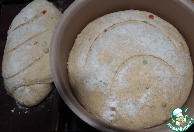• Вес теста 1260 г.. Разделить его на две части. Мне нужен был один большой хлеб, поэтому я и разделила его на неравные : 880 г. и 380 г.. Сформовать необходимые Вам заготовки. Оставить на расстойке, в теплом месте на 45 минут. В это время включить духовку на разогрев.