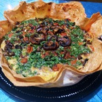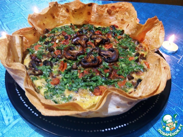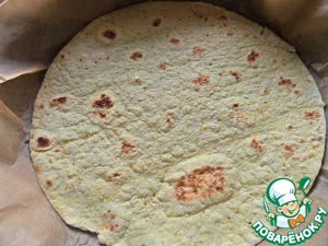• Форму 22 см диаметром я застелила промасленным пергаментом и на дно положила тортилью (можно 2).