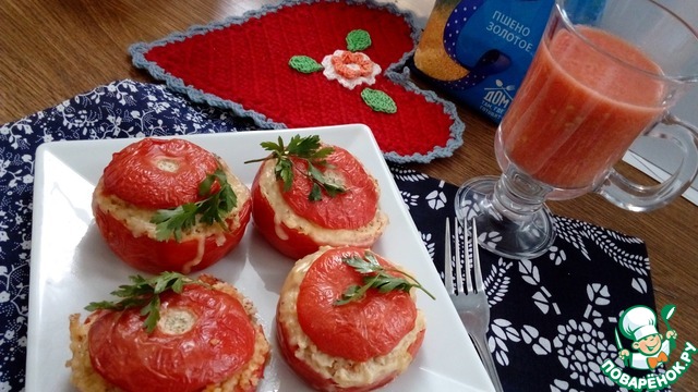 Пока запекаются помидоры, из отложенной мякоти блендером сделать сок, подсолить по вкусу. Очень вкусно запивать этим соком.